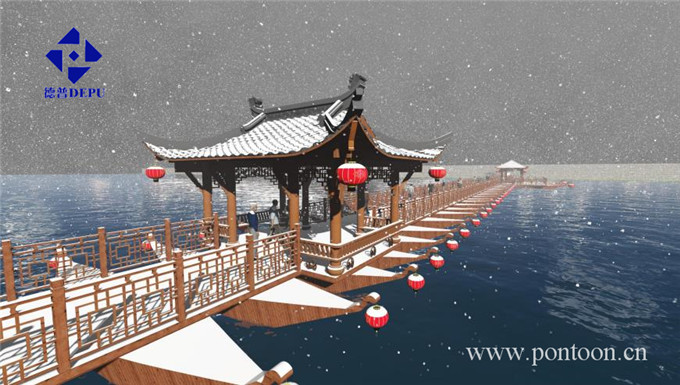 整座浮橋不僅極具特色更具文化背景熏陶,尤其舟體兩邊的燈籠晚上照亮整個(gè)湖面,在水中的倒影更是一道美麗的風(fēng)景。大雪紛飛的冬天,浮橋與涼亭及廊亭在雪中若隱若現(xiàn),給人一種幽深的感覺,仿若仙境,意境優(yōu)美,更有詩意。