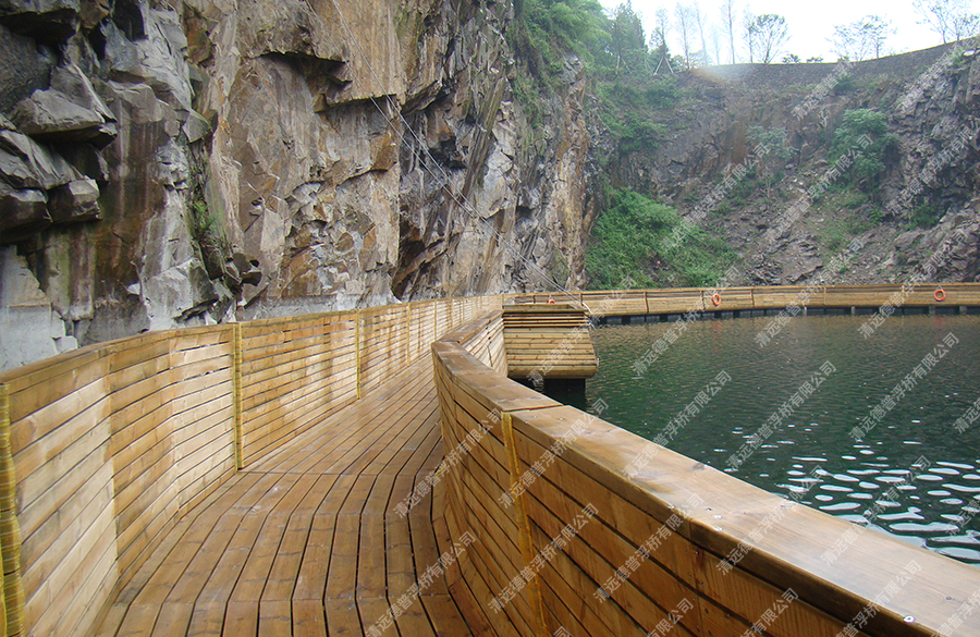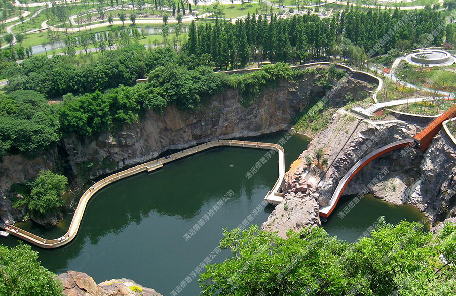 辰山礦坑花園景觀浮橋位于上海植物園西北角,通過綠環道路和辰山河邊主路與整個植物園相連。景觀浮橋是礦坑花園的主要通道,全長約160米,寬1.6米,整座浮橋采用模塊結構,由特制浮箱、鋼結構和進口防腐木面板組成。浮橋緊帖在低于地平面30米的水平面上,行走在上面宛如走在水面上,此時身邊的峭壁恍惚要倒塌,加上浮橋的小小的搖搖晃晃感覺,別具匠心,站在這座沉床式花園浮橋中間,峭壁環生,瀑布飛泄,加上水杉林遮住了陽光,此刻恍如絕境。走完浮橋是個黑乎乎的山洞,鉆過山洞再見天日,不禁感嘆礦坑花園的神奇。