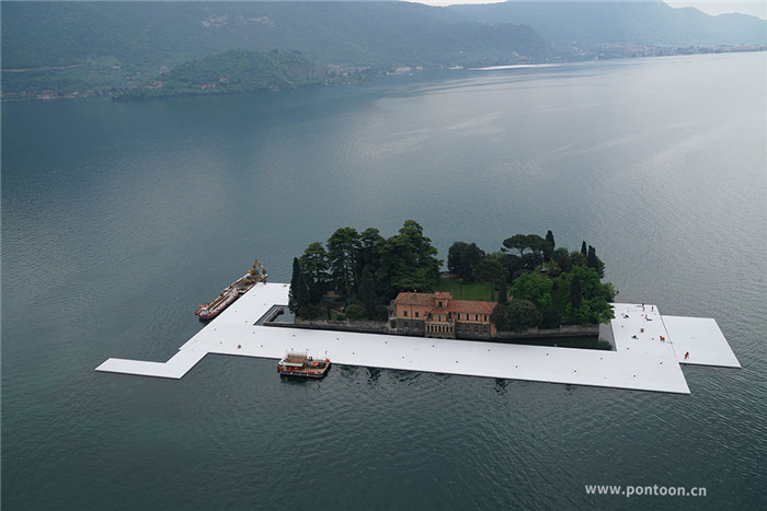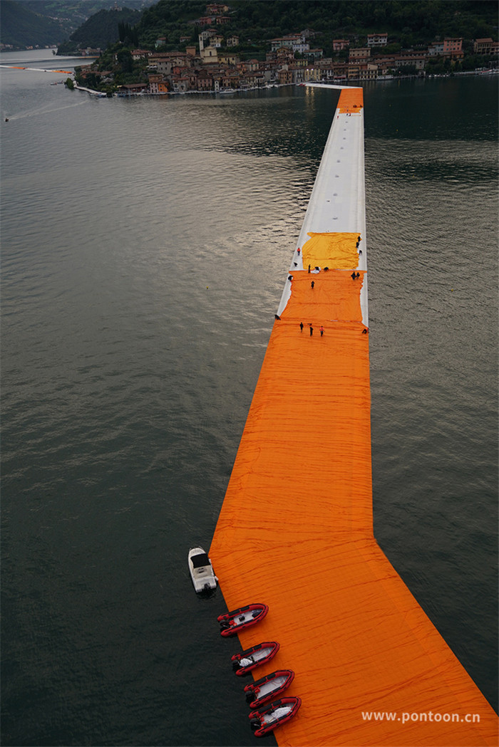 該浮橋工程由包裹著100,000平方米黃色布的三公里長的走道組成,該走道由一個由220,000個高密度聚乙烯立方體組成的浮橋系統支撐。這些元素隨著湖泊的波浪運動而自然波動。 工人們開始用第一批漂浮物包圍島的周圍 工人將其中一個框架推入浮動元件下方,然后用螺釘將其連接。 一名潛水員將一根超高分子量聚乙烯制成的繩索連接到一個斷裂的20公噸聚酯保護層上,并將其與湖床上的一個錨點相連,以將碼頭保持在地點。 碼頭的最終安裝,并用黃色織物覆蓋,完工! 標簽: 浮橋水上浮橋浮橋施工
