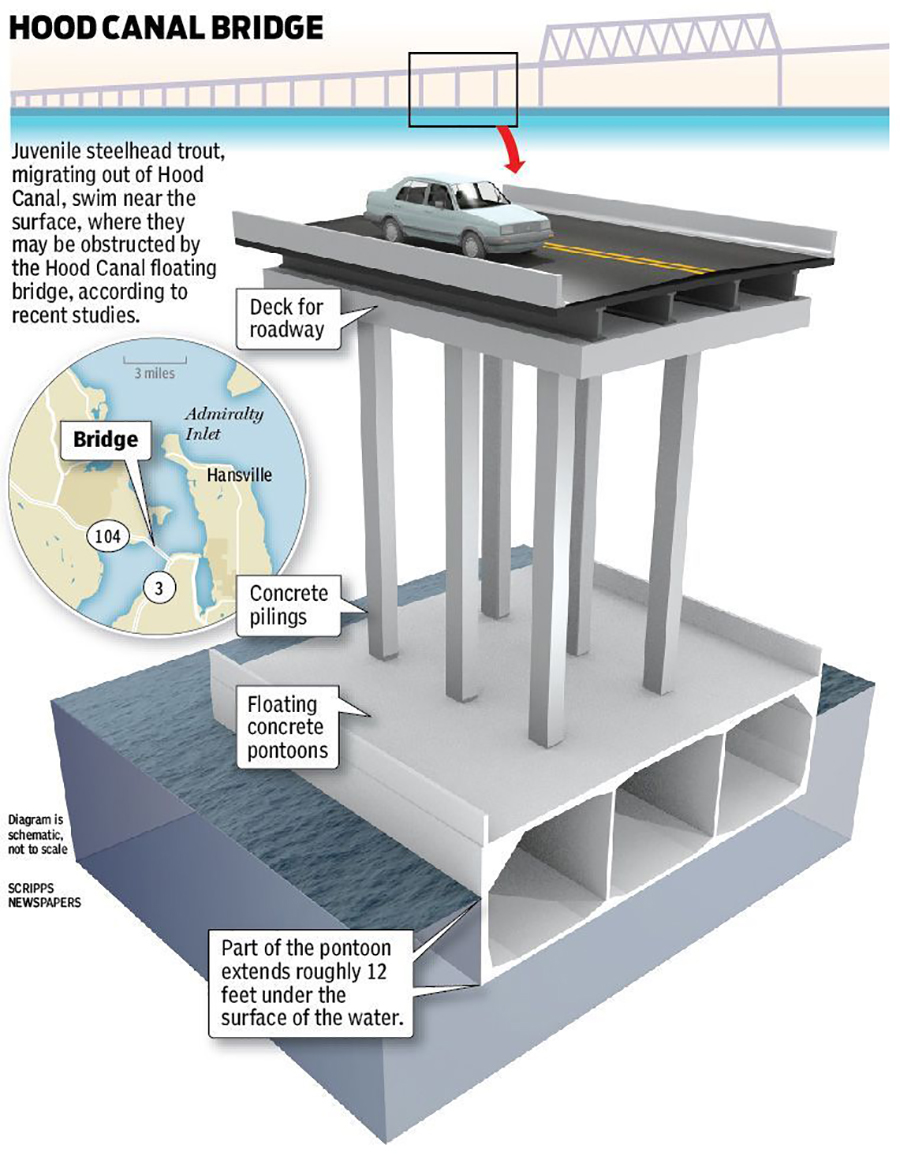 這座橋通過胡德運河,連接奧林匹克和基茨普半島。該水域水深24m到104米,由十四個浮箱支撐整個橋梁體系,浮箱在塔科馬的混凝土技術公司制作。