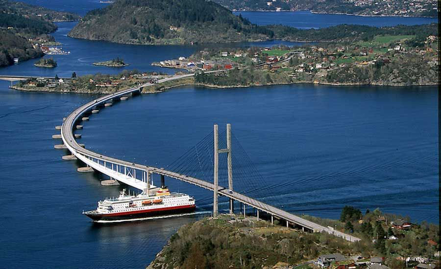 這座位于卑爾根市附近,連接著斜拉橋和大陸,橫跨500米深的Salhusfjorden。 浮動部分是一個鋼箱梁,位于10個混凝土浮筒頂部,每個浮橋有9個水封閉單元,由Aas-Jakobsen設計。